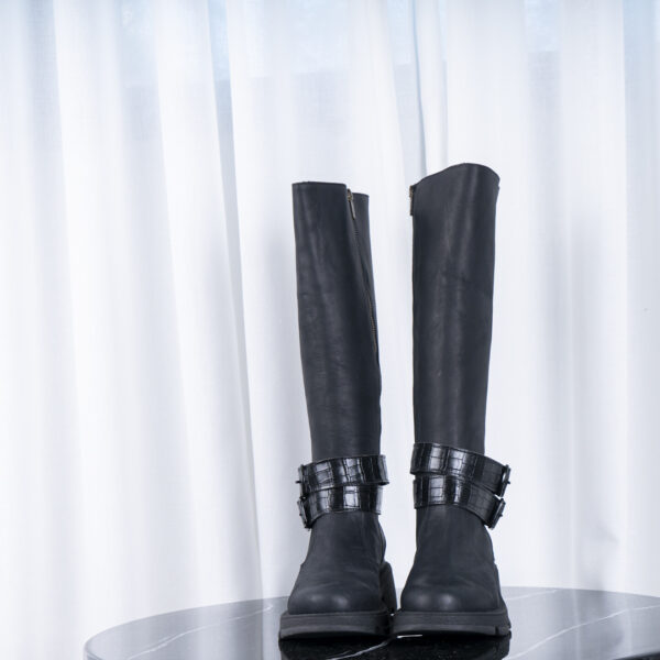 Botas Bike caña alta confeccionadas en cuero liso de primera calidad. Con base de goma inyectada, cierre al costado, 2 tiras de cuero crocco, hebillas negras y forrada x dentro.