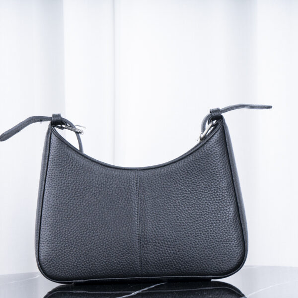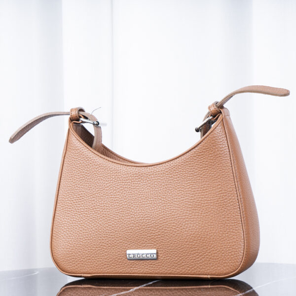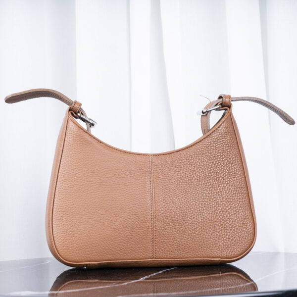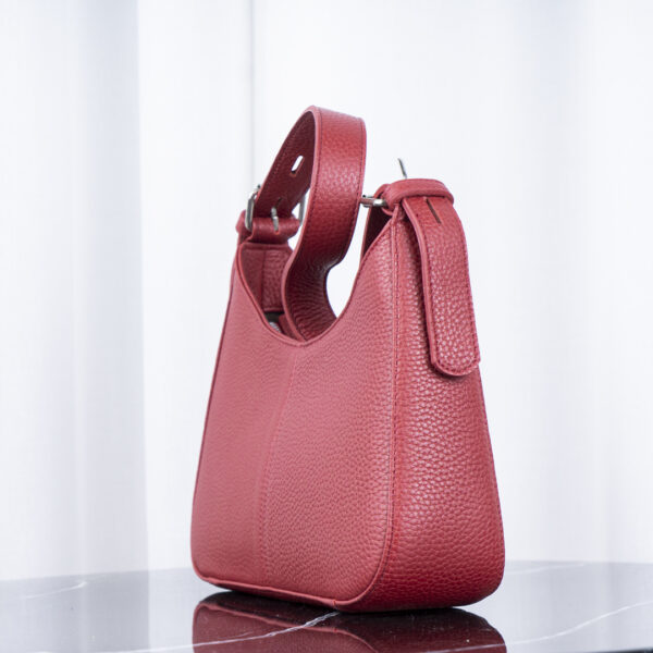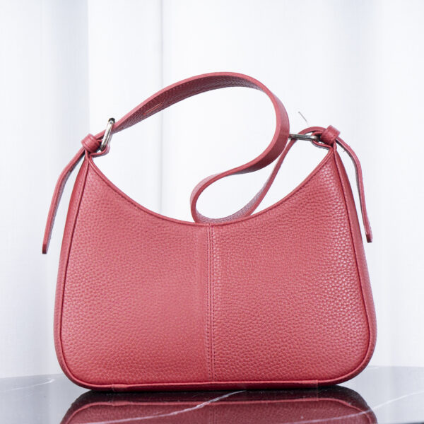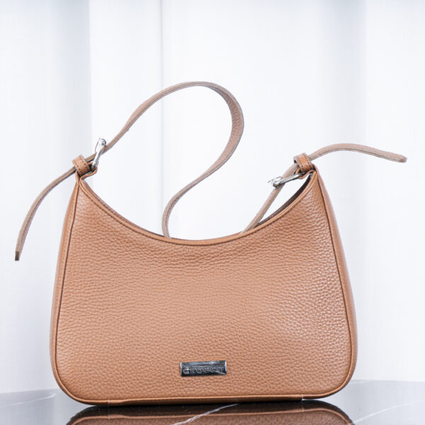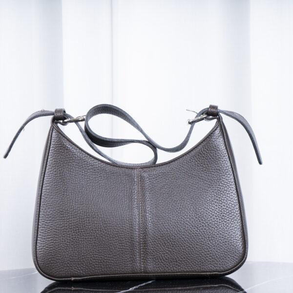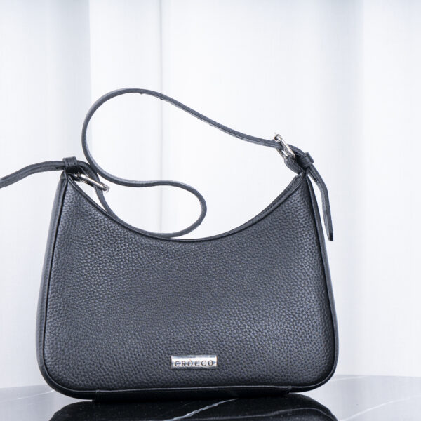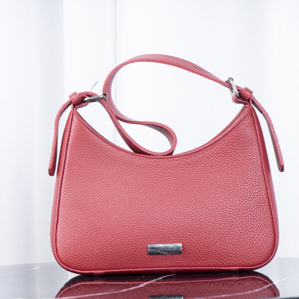 Tamaño pequeño con tira al hombro, ojales en níquel y cierre.